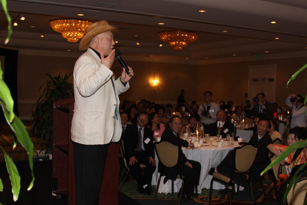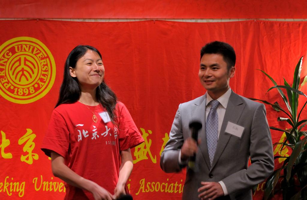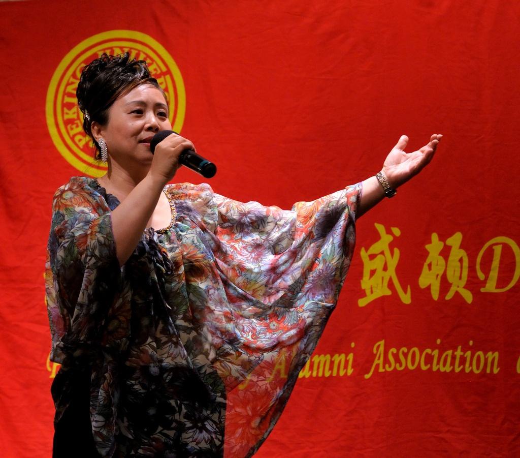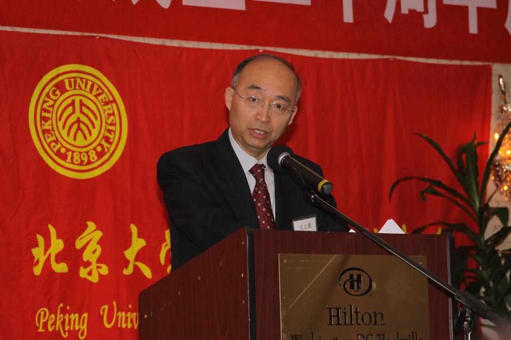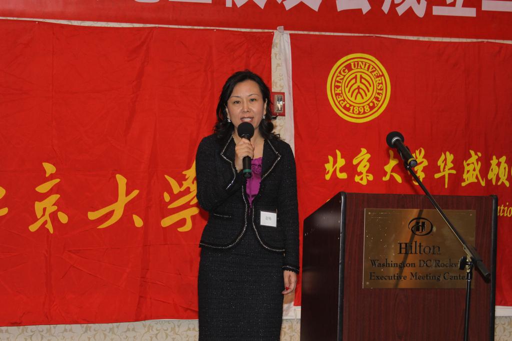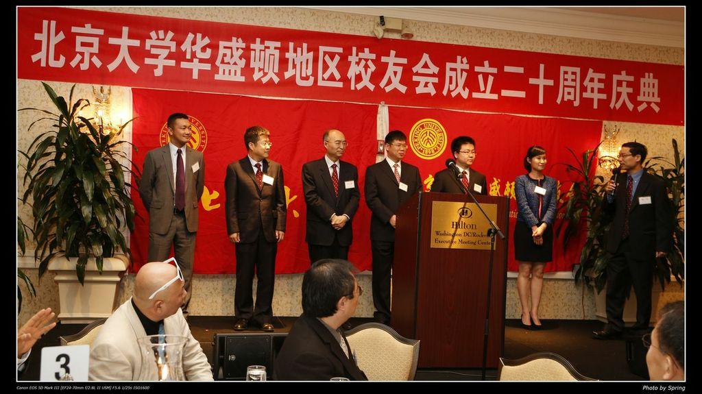 在主持人朱砂和石拓的风趣幽默的开场白后,北京大学大华府校友会会长鲍一明致欢迎词,他简短回顾了校友会二十年来的发展历程,感谢各位校友会前会长、理事会成员和广大校友们对校友会工作的贡献和支持,并介绍了六位专程由母校赶来参加庆典的代表团成员:北京大学常务副校长吴志攀,人事部副部长戴长亮,国际合作部副部长王勇,校友工作办公室副主任王宇, 国内合作办公室副主任孙基男, 教育基金会欧美部副部长赵琳。之后,前会长赵畅介绍了到场的嘉宾:中国驻美大使馆参赞兼副总领事、校友何岚菁和一等秘书庄元元;国际金融公司执行副总裁及CEO、校友蔡金勇;世界银行副行长、校友祝宪;马里兰州众议员Susan Lee;马里兰大学前校长Mote 博士;来自台湾的北大老朋友李志翔夫妇;以及红遍网络的脱口秀笑星、校友北美崔哥。赵畅同时感谢同乡会协会,大专院校校友会联合会,华专联,美中工商联合会,广东同乡会等社团和参加过北大研修班的企业家们对此次活动的支持。