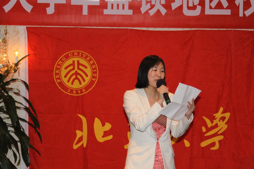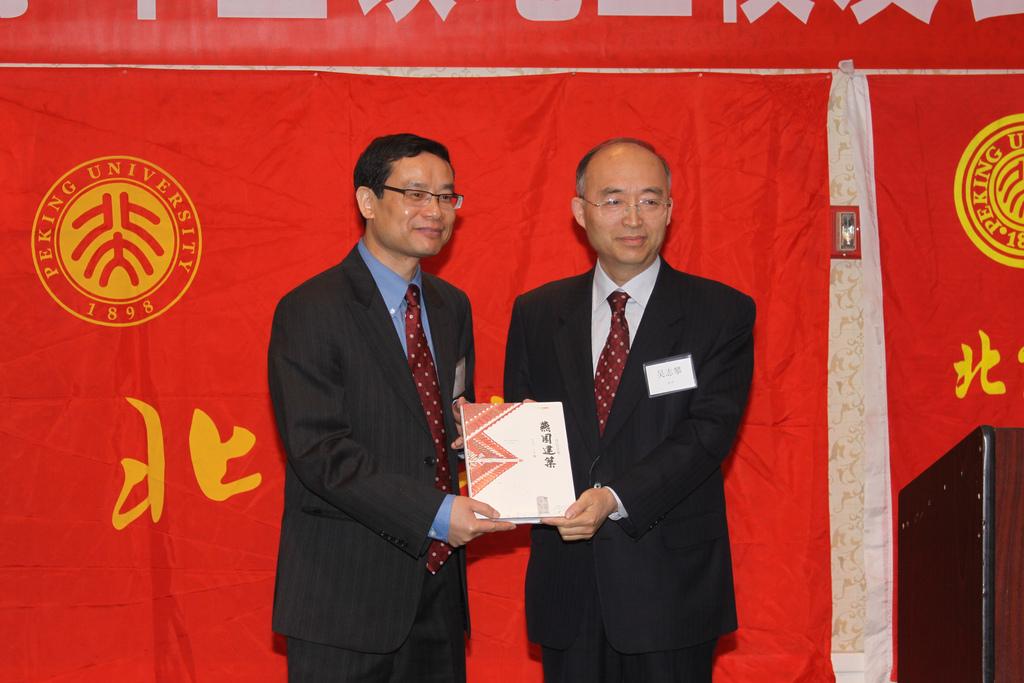 在嘉宾中,吴志攀副校长首先致辞,对母校发展的现状和未来规划做了报告。校长的发言细密睿智,他说,北大作为北京83所学校中规模最大,人口最多的学校,远远超过其它学校,有120个本科专业,360多研究所,48个博士流动站,在北京地区的8家附属医院,18个国家一级重点学科。现有本科学生1万4,研究生2万1,留学生4千, 博士后1千1,图书馆藏书9 70万册,排名全国第三,仅在国家图书馆和上海图书馆之后。在学科方面,北京大学18个学科进入全球的百分之一。平均每年稳定的SCI文章3000多篇。在未来的发展方面,吴校长指出了三点:教学方面,提倡的小班上课,在这方面会面临极大的资源压力,同时教职人员也会面临很大的压力,但是学校仍然会努力向小班授课发展;科研方面,在现在硬件设施和全世界持平的状况下,要追求一种成熟心态,由数量和短期的效益转到质量和长期的发展,要鼓励原创;同时要侧重基础科研到应用学科的转化; 人才培养方面,吴校长提倡面向世界、面向基层。吴校长最后在发言里对在外的校友们说了他一点希望,他说,北大人还是应该有一些责任,面向世界的北大人应该更多地担当起向世界介绍中国、和向中国介绍世界的胸怀。校友们纷纷表示很有同感,相信在这方面也会有越来越多的校友做出贡献。吴校长讲话完毕,向校友会赠送了一本《燕园建筑》作为礼物,想必又会勾起在座校友的思校情怀吧!吴校长还即兴赋诗一首,向校友会二十周年表示祝贺: