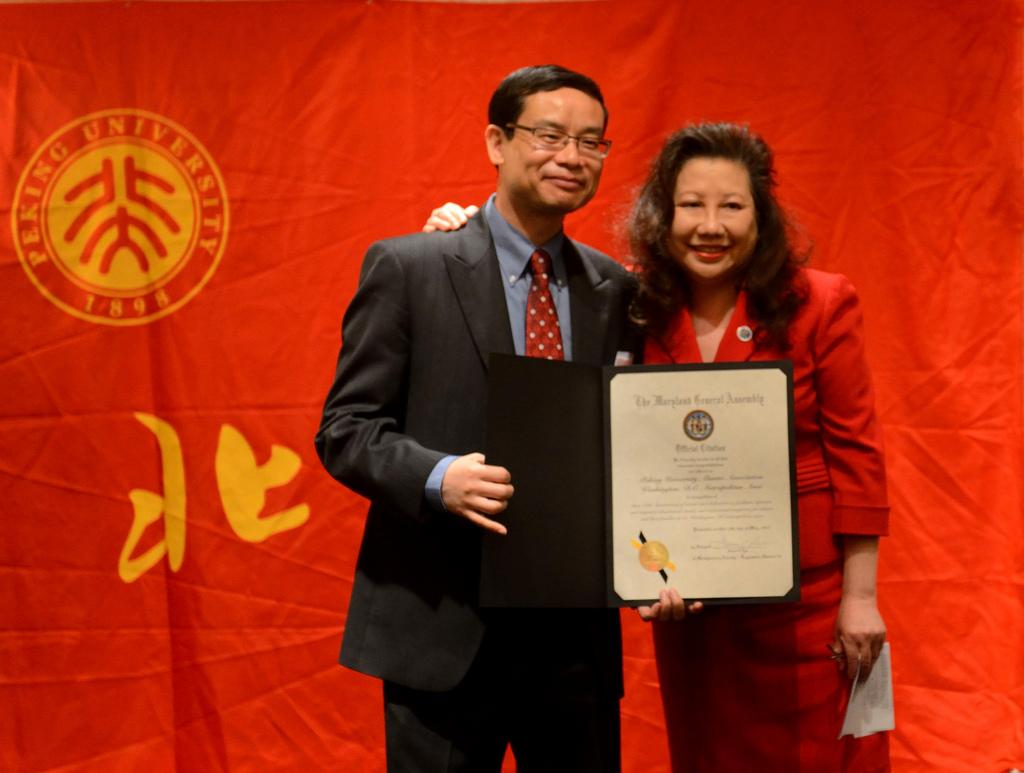 马里兰州的众议员Susan Lee首先对在场的母亲表示了感谢,校友会的生日庆典恰巧在母亲节举办,也是一种校友们和校友会关系的一种最生动的写照吧!Susan Lee 认为大华府校友会是本地社区里一股极有激情、极有力量的一个组织,并衷心祝愿校友会以后继续良好发展。她还代表马里兰州议会向校友会颁发了证书,表彰校友会在二十年里为大华府地区的校友们组织、推动各类活动。